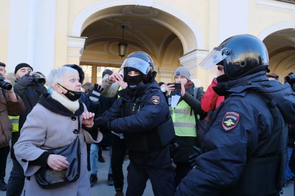 “They took my [internal] passport and at this point, evidently, they realized that I really am a survivor of the Siege—it’s written there in my passport where and when I was born. They started asking me whether maybe they should call an ambulance for me. I said, ‘I don’t need any ambulance, and I’m not going anywhere—I’m staying here with the young people.’Then they came in again: ‘Let’s go!’ And this time the kids said ‘Go on, go on.’ So I went—got out of the paddy wagon and once again started yelling ‘No war!’, and told the young folks in parting, ‘I love you. You’re marvelous!’”