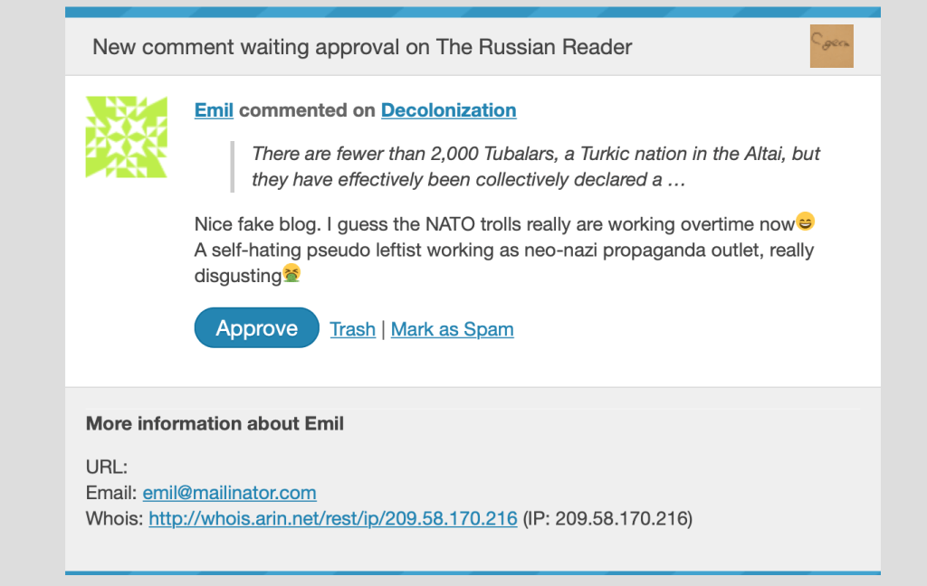I have no doubt that there are plenty of natural-born anti-vaxxers in our society, but the uniformity, absurd rage, and standard advice (e.g., “hire a lawyer and take them to court”) evinced by at least some of the social media commentators expose them as Prigozhin’s trolls.