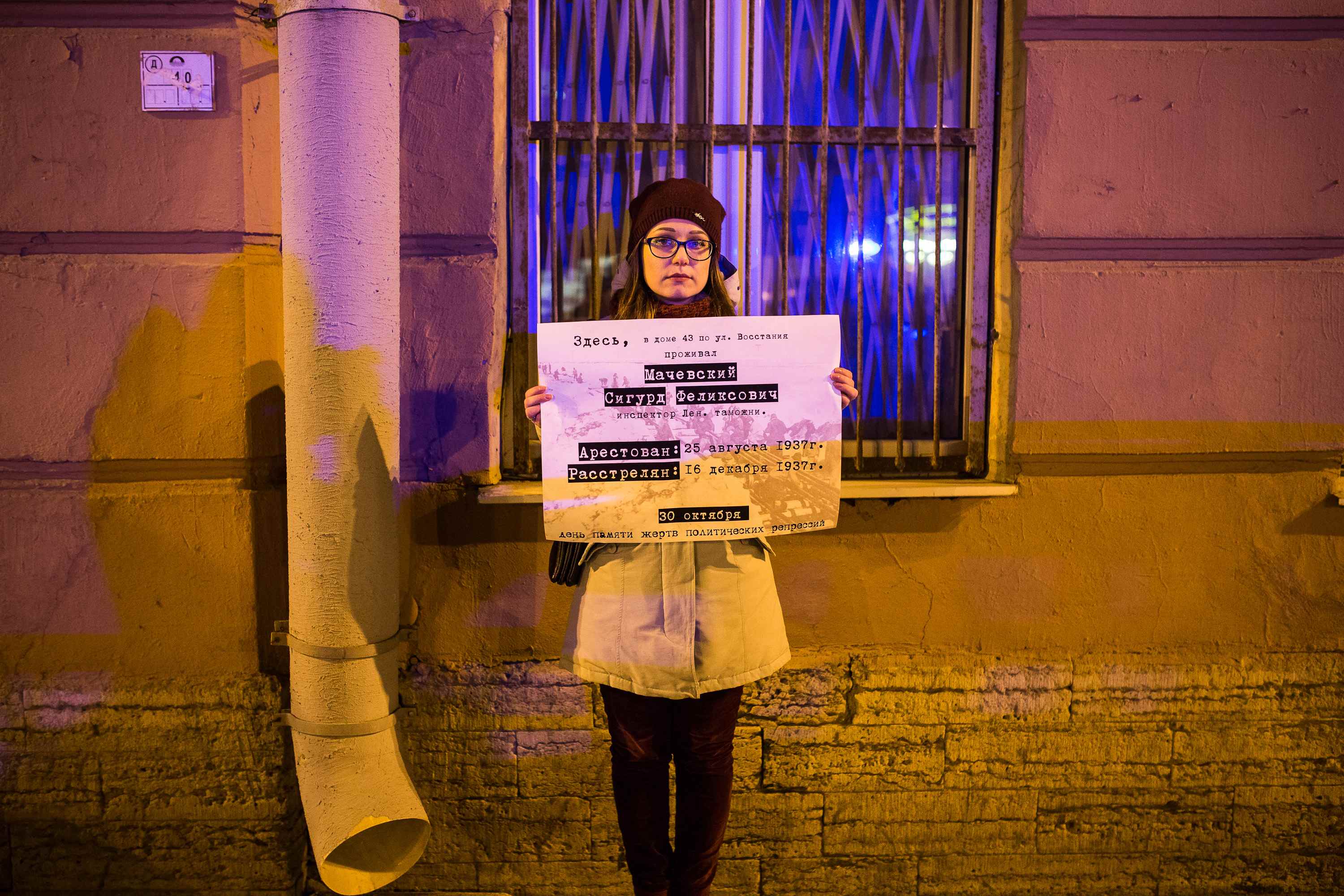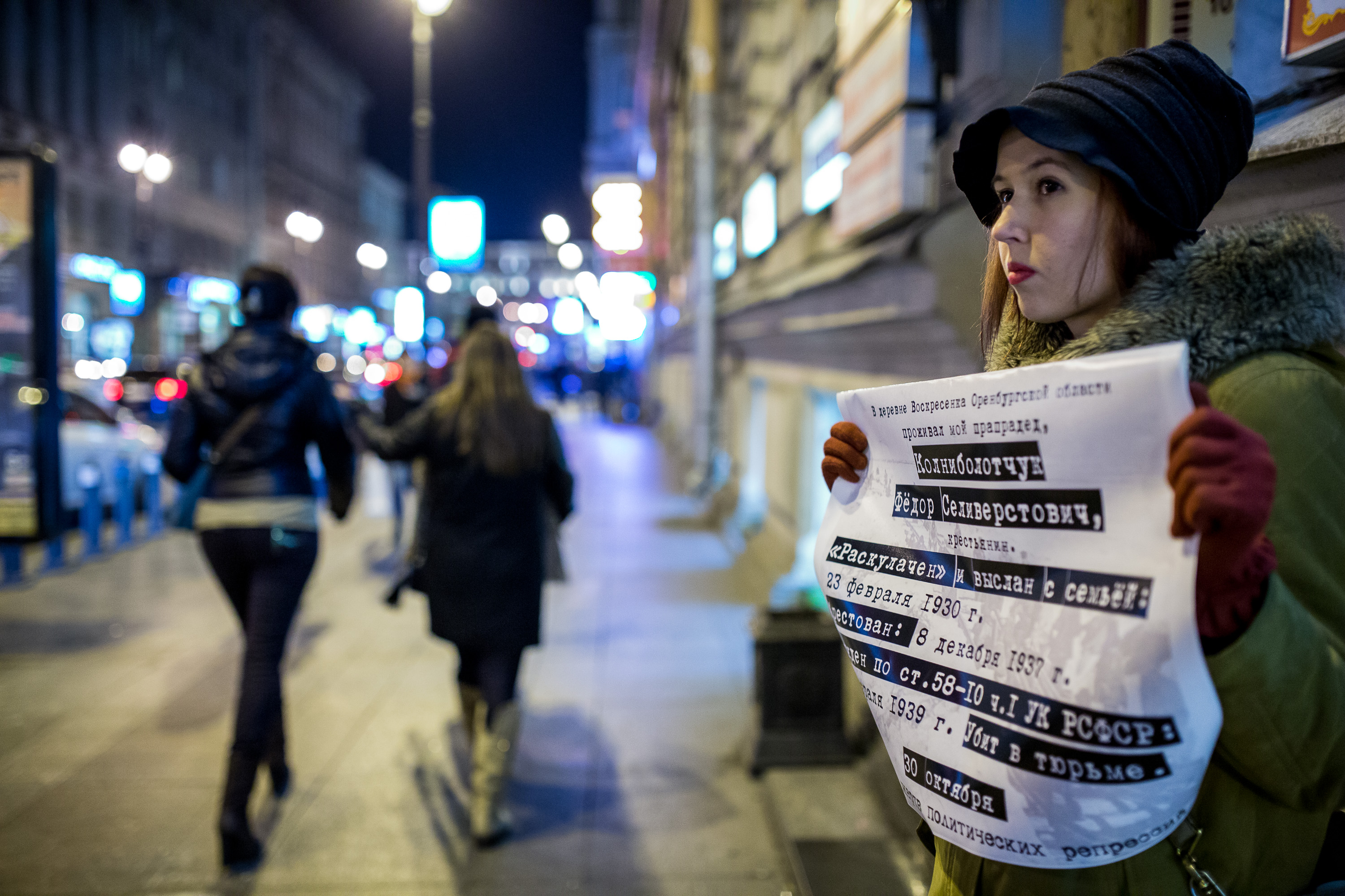 Petersburg democracy activist Pavel Chuprunov, holding a placard that reads, “‘Yes, we tasered them, but it wasn’t torture. We were doing our jobs!’ Admission by the