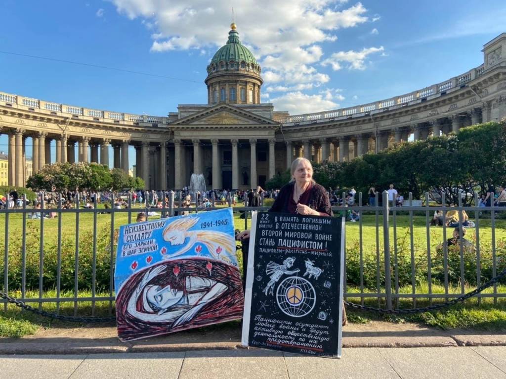 Yelena Osipova, photographed in front of Our Lady of Kazan Cathedral on Nevsky Prospekt in downtown Petersburg on 22 June 2022. Photo courtesy of Irina Bogdanovskaya, as posted on the public Facebook page Yelena Andreyeevna Osipova. Artist. Citizen. Thanks to Maria Mila for the heads-up. The placard on the left reads, “To the unknown soldier, 1941–1945. He was buried in the earth.” The placard on the right reads, “22 June 1941–1945. In memory of the Patriotic/Second World War. Become a pacifist! Pacifism – pacificus – peaceable. Pacifists condemn all wars and campaign vigorously and publicly to prevent them.” On 22 June 1941, Nazi Germany launched Operation Barbarossa, a massive invasion of the Soviet Union. Ms. Osipova was born on 11 November 1945, that is, six months after the end of the Great Patriotic War.
