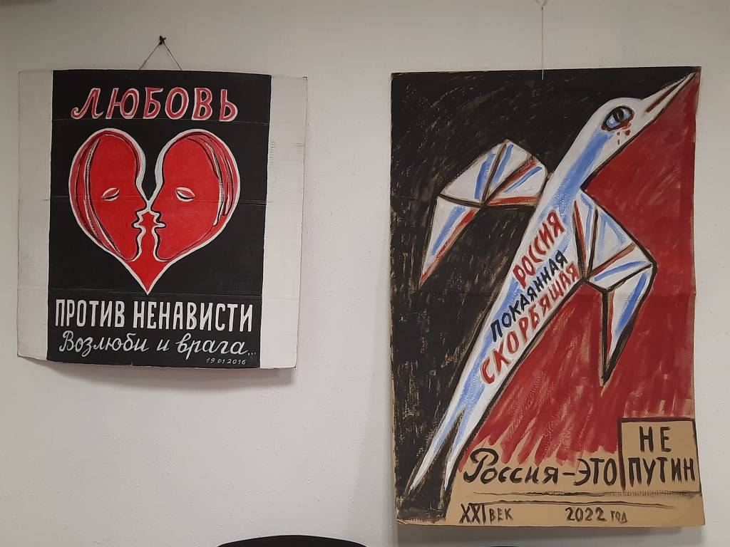 Yelena Osipova“Nord-Ost: People, Stop the War!”“Eyes of Conscience: ‘Mama, I’m Afraid of War'”“Love vs. Hate: Love Your Enemy Too”“Nuclear Waste from Various Countries Is Transported through St. Petersburg”Yelena Osipova with her works at the Yabloko party’s offices in Petersburg“A Russia Without Putin: A Russia That Won’t Be Feared, But Admired! A Peaceful Russia”“Syria. Russia”